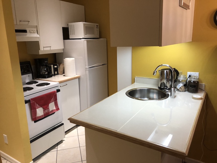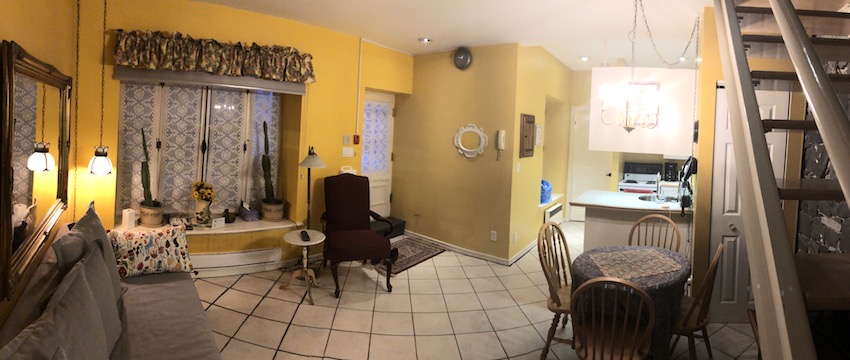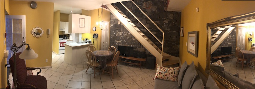 Cuisine, salon et salle de bain au premier niveau.