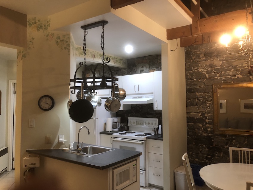 Cuisine, salon et salle de bain au premier niveau.